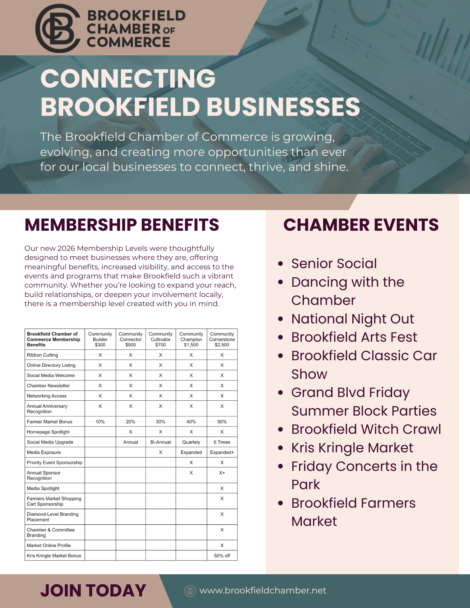 2026 launches a new membership platform for the chamber allowing businesses to choose the tier that best serves their needs. We've worked hard to restructure our membership packages to bundle the entire year into one smart investment- offering built-in exposure, event participation, and discounts that often cost significantly more when purchased separately. Rather than being approached for donations to individual events, each level gives members a roadmap to grow within the Brookfield community. Membership levels have been thoughtfully curated to give additional representation, marketing and event sponsorship to our members.